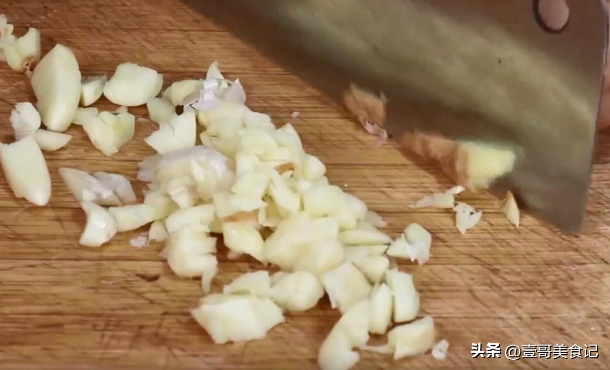 2.取出一点大蒜,最好能多取几个。先把大蒜掰成一瓣一瓣的,然后放在案板上,用菜刀的刀背给拍破,这样就能轻松地将蒜皮给剥掉了。接着,把去皮的大蒜放成一堆,用菜刀来回的剁,直到剁成蒜沫就可以了。