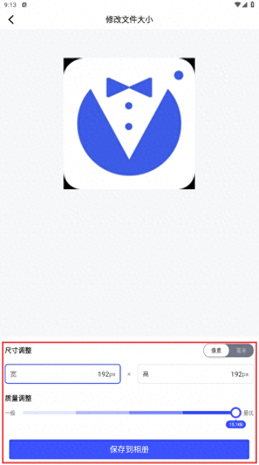 打开“修改文件大小”之后,我们就可以选择需要调整大小的图片了,大家可以看到可以修改照片的尺寸以及质量,根据要求以及大小来改变就可以了,完成之后就保存到相册。