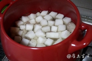 2. 用一根筷子可以很轻松的插透牛腩块,此时的牛腩就炖好了。白萝卜去皮,切块,块大小和牛腩块大小差不多就可以,倒入锅内,继续炖15分钟。此时可以调入一部分盐,酱油,火锅调料包