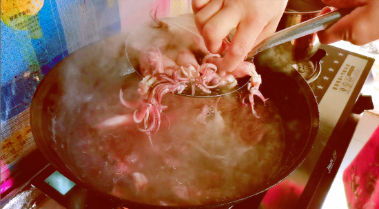 我们在笔管鱼里加入适量醋,搓洗一会,搓出笔管鱼身上的粘液,这样吃的时候不腥气。因为笔管鱼是一种软体动物,一煮就容易老,锅中水还没有烧开的时候加入半袋盐,搅拌至盐融化。盐可以让笔管鱼表皮的蛋白凝结定型,这样笔管鱼就不会回缩得那么明显,煮出来的颜色也非常光鲜艳丽,看着就食欲满满。笔管鱼直接下锅煮就错了,难怪肉老咬不动,多加一步,鲜嫩又脆爽!