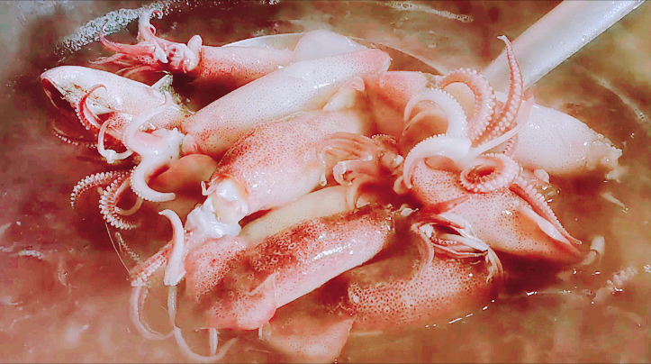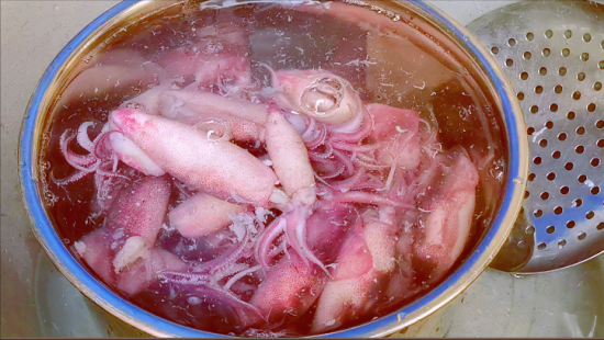 煮笔管鱼时,有人用温水,有人用凉水,其实都不对,教你正确方法。我们应该开水下入笔管鱼,像煮饺子一样,笔管鱼高温定型了,就不容易回缩,变老。大约煮3~5分钟,用手捏一捏笔管鱼肚子发硬,里面的籽都熟了,这时候我们就可以捞出来了