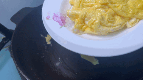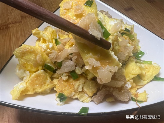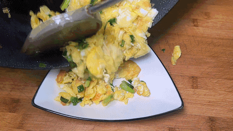 11. 将炒好的鸡蛋装盘,将油渣碎撒在表面,美味即享