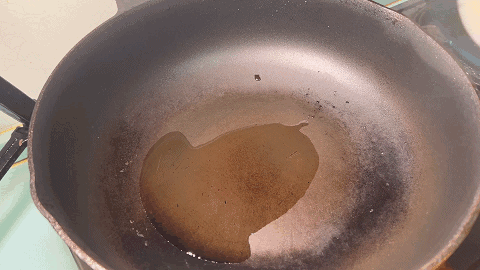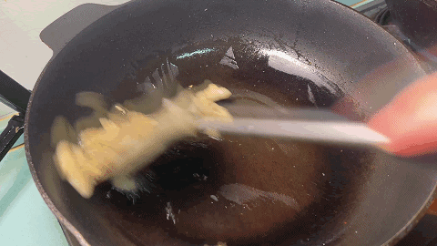5. 中小火慢炒,炒出油脂,炒成略微焦焦的颜色,将油渣盛出,