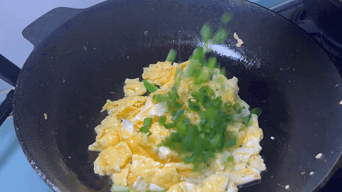 9. 倒入葱段翻炒均匀,加入鸡蛋块翻炒
