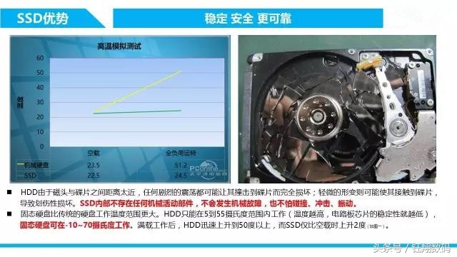 普通硬盘存在机械装置,最怕震动,需轻拿轻放,固态硬盘没有机械部件,在这方面有得独厚的优势,耐摔耐碰更耐热,数据更安全。