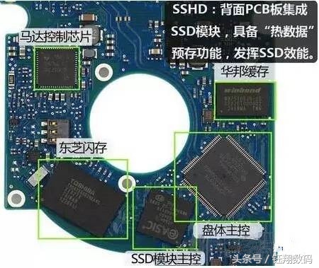 就是机械硬盘与固态硬盘的结合体。主盘体和机械硬盘是一样的,但是在电路板部分增加了SSD模块和闪存颗粒。混合硬盘采用了容量较小的闪存颗粒来存储常用常用文件,容量通常在8到16GB之间。而磁盘才是最为重要的存储介质,闪存仅起到了缓冲作用,将更多的常用文件保存到闪存内减小寻道时间,提升效率。