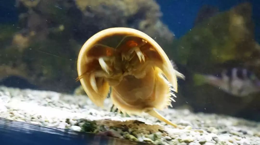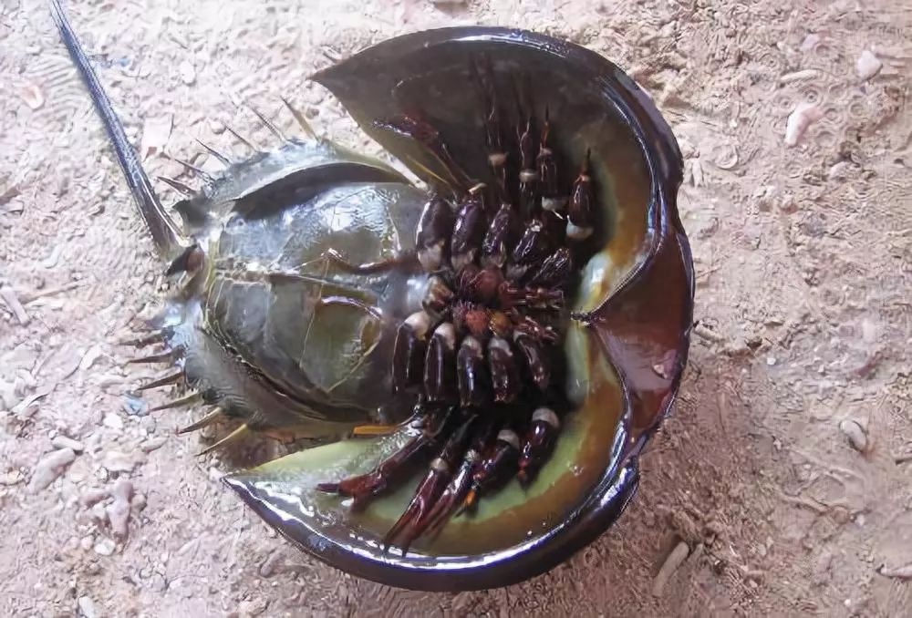 在陆地上,头胸部的六对附肢也刚好派上用场。倘若换在水中,鲎就会背部朝下拍拍书腮,游泳而行。此等水陆两栖的能耐不容小觑。