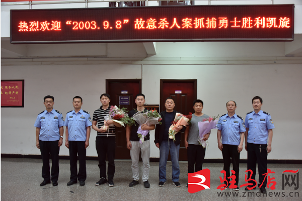 驻马店网讯 (记者 熊国森 通讯员 聂乾卿 罗涛)5月26日晚,平舆县公安局刑警大队一楼大厅灯光辉煌,上方红色电子屏上的一行大字格外醒目:热烈欢迎“2003.9.8”故意杀人案抓捕勇士胜利凯旋。着装整齐的几十名刑警排成两列,期盼战友胜利归来。
