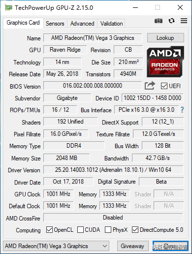 VEGA 3核显的规格就不多说了,通过众多评测很多朋友已经比较熟悉:192个流处理器,核心频率1000Mhz(不可超频)。顺便吐槽一下核显对显存的调用方式:固定吃掉2GB系统内存,而不是小容量固定+动态调用。这意味着如果你安装了8GB内存,最高只有6GB可用了。