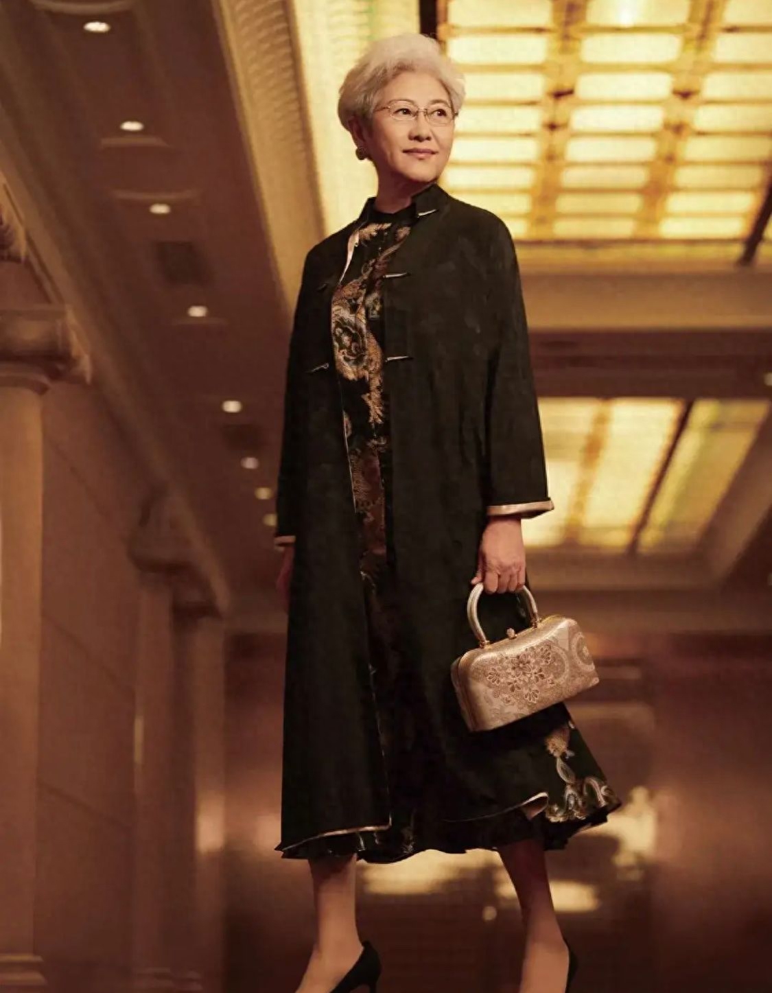 穿西装不能过于古板守旧,要适当地融入时髦的手法很重要,特别是到了奶奶辈儿的年纪,懂得穿搭技巧更显气质,像傅莹这一套蓝色旗袍衫配深蓝色西服套装,就采用了同色系手法,舒适又大气。