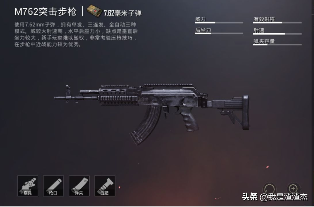 在游戏中M762是一把综合能力很不错的枪,在中近距离能爆发出强大的火力,在远距离也有不俗的精准度,最远射程可达到400米,但后坐力较大不建议新手使用。射击模式拥有单发,三连发和全自动,因为使用7.62毫米口径弹药,所以在近距离三连发下伤害力碾压m416,成为近战新宠,并且此枪性能与m416不分上下。在配件槽方面,拥有5个配件槽,可安装瞄具(红点全息2-6倍),侧瞄具,枪口,握把与弹匣。推荐大家用M762这把枪的,威力高,射速快,满配后的稳定性可操控,整体是一把很全面的枪械。那么在使用上,这里还推荐大家用激光瞄准器这个小东西,因为发现很多时候的刚枪是来不及开镜的,开镜刚枪也只适合中远距离,近距离还是会选择腰射,那么在用M762腰射的情况下,激光瞄准器这个东西就能帮你大忙了。