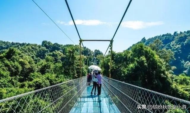 接着,去双龙沟景区,原始森林的度假区,有一网红玻璃桥,广西第1座悬索玻璃桥,长达200米。在山间走一走还可以看到野猫、野鸡、竹鸡,以及一些瀑布。,下山的时候可以做滑索下山,从山上到下到终点只需要50多秒时间,还可以玩丛林飞车下山。