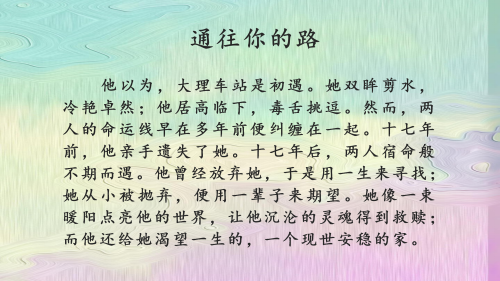 十七年前,男主邻居家妹妹遇险,紧急下他只救了一个,而被他放弃,就是女主。多年后的遇见,女主一眼就认出来了男主,但却没吱声,两人经历过一段旅途中的恋爱后,后期有过针锋相对,很精彩,小说涉及的话题很有深度,真心好看,别错过。