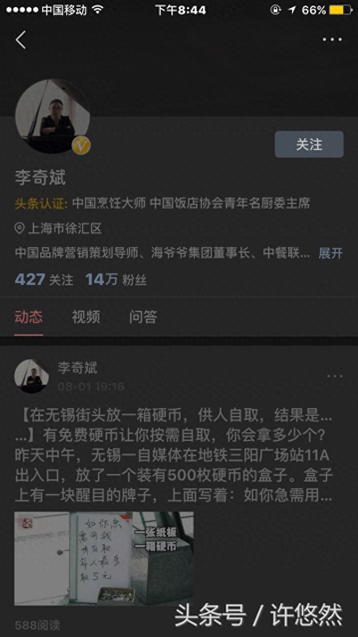 不管“李奇斌”的头条帐号是团队还是个人的运营,所产生的效果值得被研究。