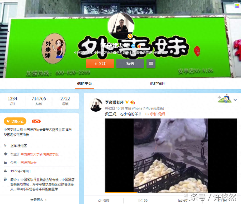 不管他的职业身份中,烹饪大师的水准如何,但个人简介中的品牌营销策划的实力是有目共睹的。