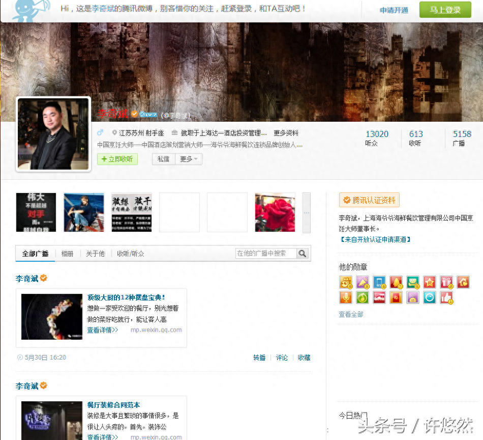看看他的头条认证:中国烹饪大师、中国饭店协会青年名厨委主席