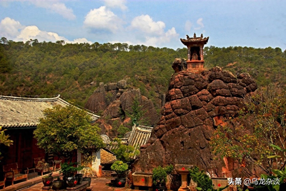剑川石宝山位于剑川县城西南25公里处,因山上的红砂石成龟背状裂纹,如狮似象像钟,得石宝之名。这里林木茂盛、石趣无限,庙宇别致,景色独特,尤以石窟和摩崖造像而声名久远。是老君山山脉向南延伸的一个支峰,属澜沧江水系。“石宝”是指石宝山上独具特色的丹霞地貌—龟背石。《万历云南通志》载:“石宝山,在州之西南二十里,有石佛、石栈、石人、石井、石伞、石象、石狮、石钟、石鼓之异,五色踯躅,被于陵谷,信奇观也”。