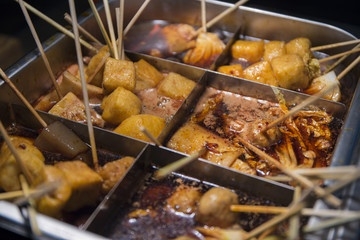关东煮是源于东北的火锅子、后传到日本关东地区、在日本关东地区得以发扬、现在台湾的关东煮基本是传承了日式风格的。在中国关东煮汤料分为南甜北辣2种口味、在日本关东煮、关东炊”。目前日本、台湾、国内基本关东煮清汤底料都采用日本汤料的配置方法、辣汤底料稍有区别、通常关东煮食材,包括剥壳鸡蛋、切片白萝卜、黏玉米、关东煮粉丝、甜不辣、鱼豆腐、关东煮弹面{拉面}等这些材料都放在关东煮底料熬制,可以用来佐饭,也可以作小吃、稍加调味后即可进食。