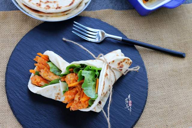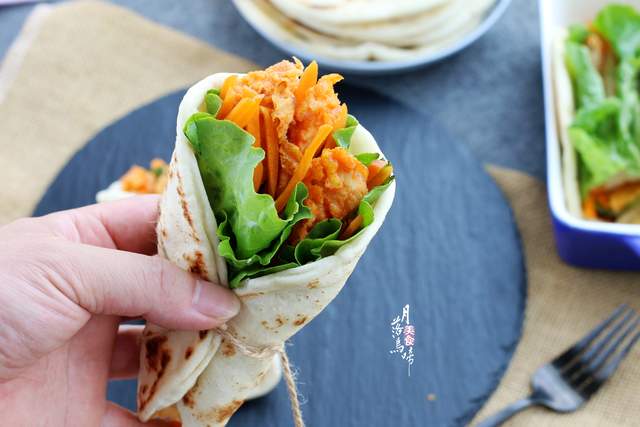 春饼卷上鸡肉、胡萝卜和生菜,开吃。