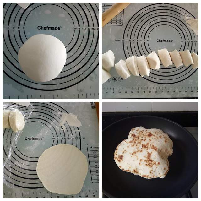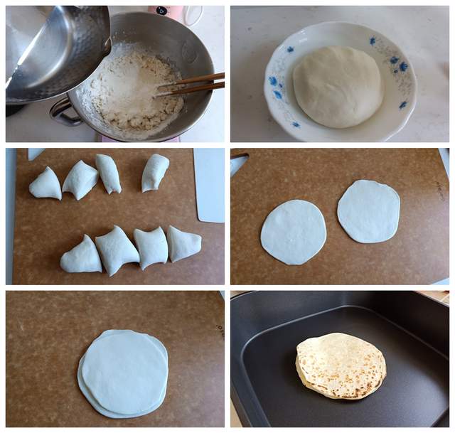 平底锅加热,预热一下,放入面片,面片会慢慢鼓起小泡,最后会变成一个大包,就像一个充气的气球,哈哈,特别好玩哦!