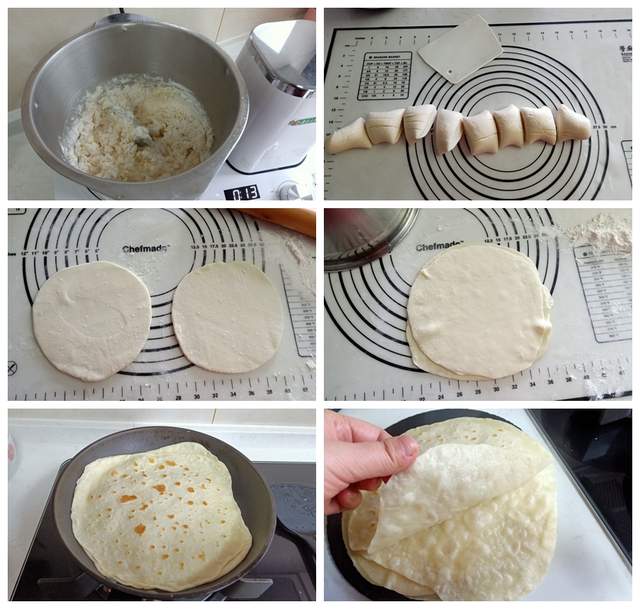 把面团分成几个小面团,每个面团擀成薄面片,叠在一起,中间抹油,再次擀薄。平底锅不加油,预热一下,放入春饼中火加热。看到有鼓起,很快翻面,两面都出现金黄色小点,立即出锅,撕开,就是两张春饼。