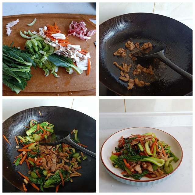 主要由青菜、蘑菇、胡萝卜、肉丝组成,先炒肉丝,再炒蔬菜,加盐、酒、酱油调味。
