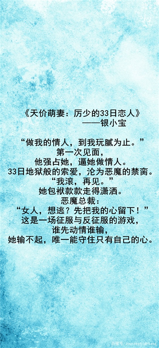 推语:简介和开头都比较雷人的作品,别名《天价小娇妻:总裁的33日索情》,一度差点弃文,好在后面坚持下来了,之后的情节开展还是非常有看点的。男主厉爵风的家庭非常复杂,属于那种有黑道背景的家族,为了保护女主顾小艾,两人分开了几年。后来顾小艾被卷入了这个家族,知道了很多阴暗的地方,也知道自己的儿子还活着,两人经历了很多身不由己的情境,好在结局圆满。这部作品一定不要被开头劝退,要耐心读下来。