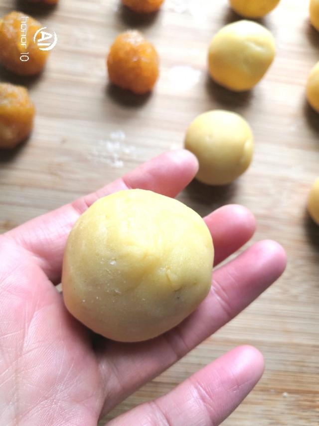 1小时后,把酥皮面团和风梨馅都取出来,馅分出9个15g搓圆,皮分出9个25g搓圆。