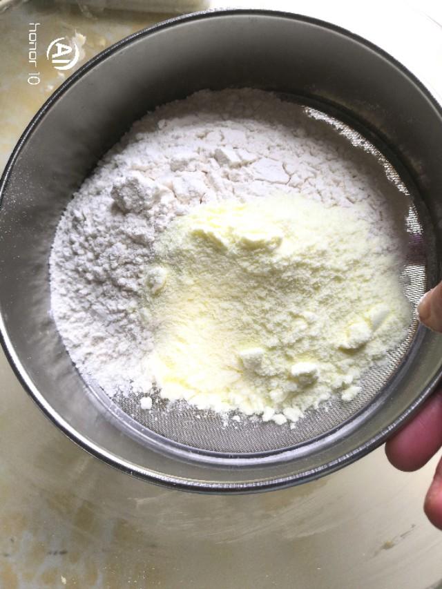 所有蛋黄全部和黄油融合后,把低筋粉和奶粉过筛倒进去,不用打发,翻拌抓揉成面团,放冰箱冷藏1小时。