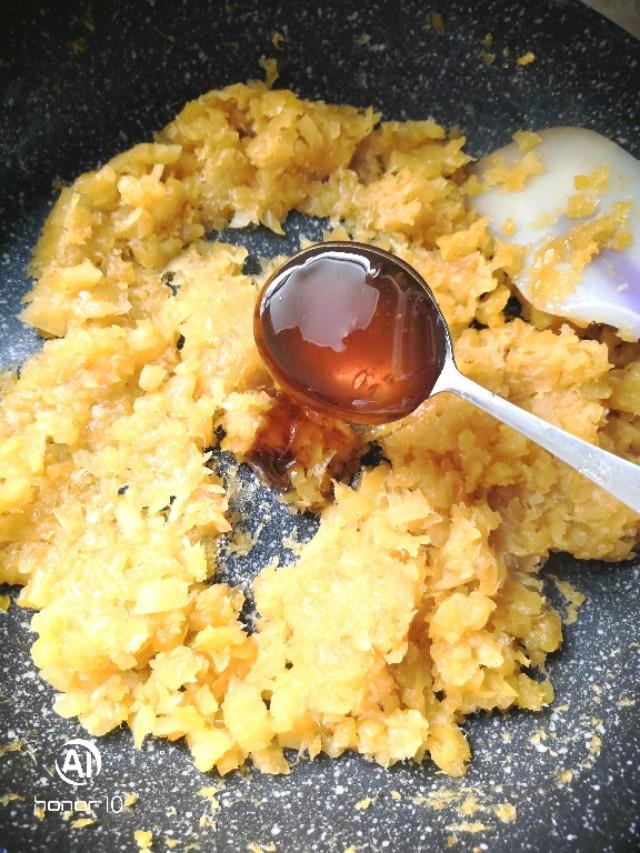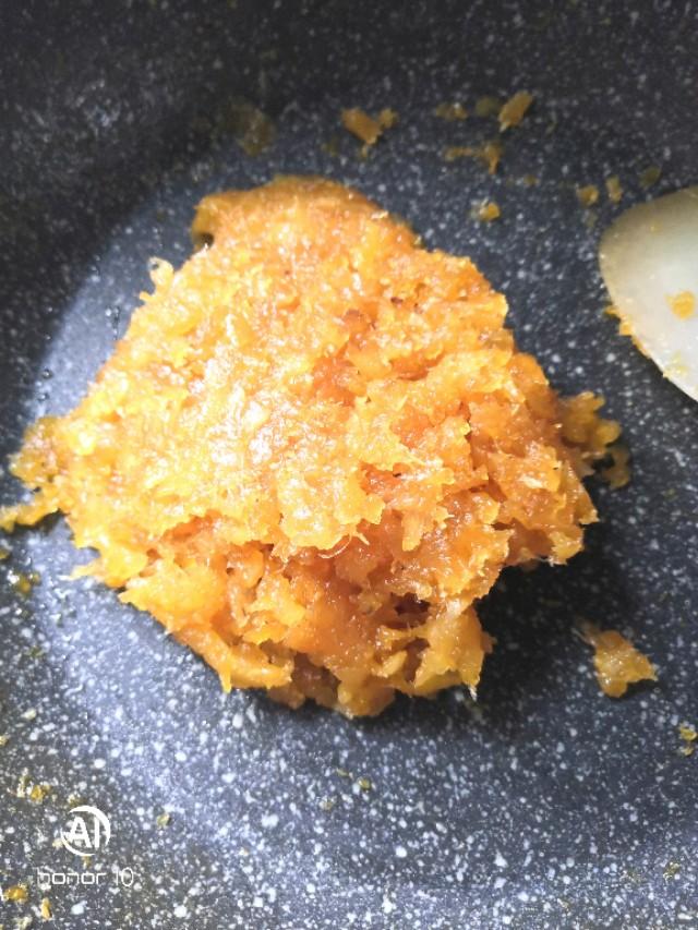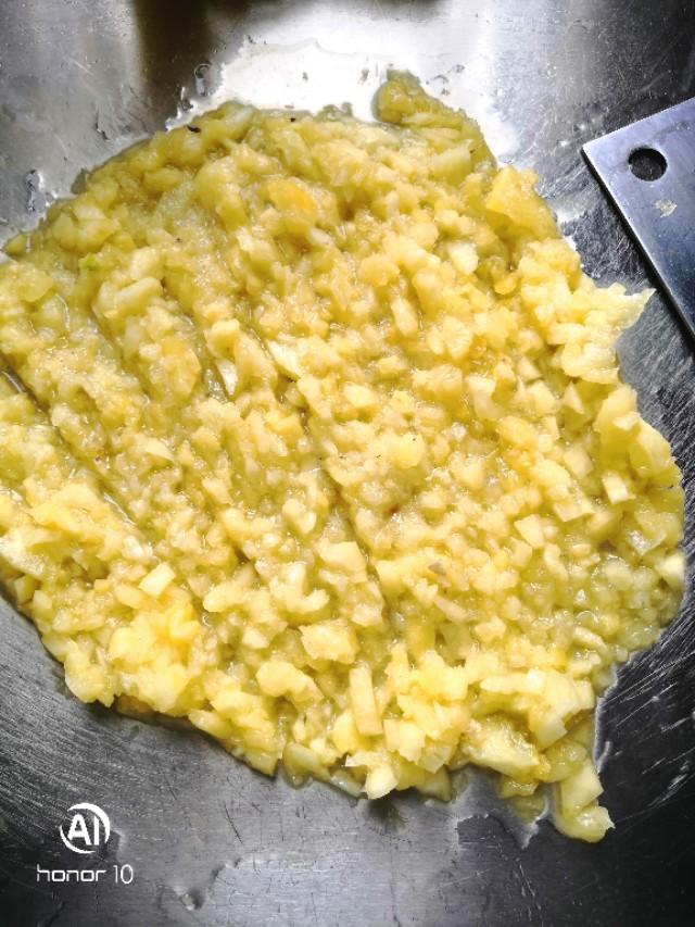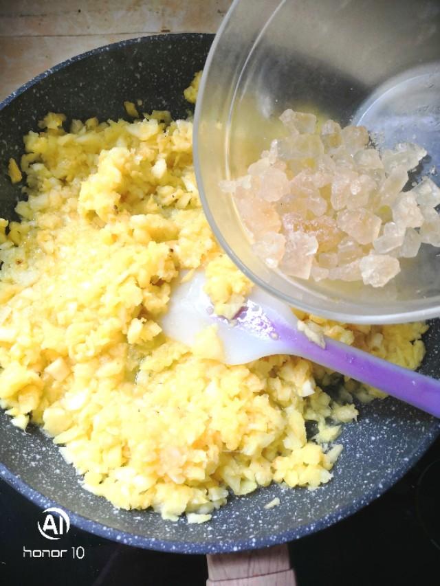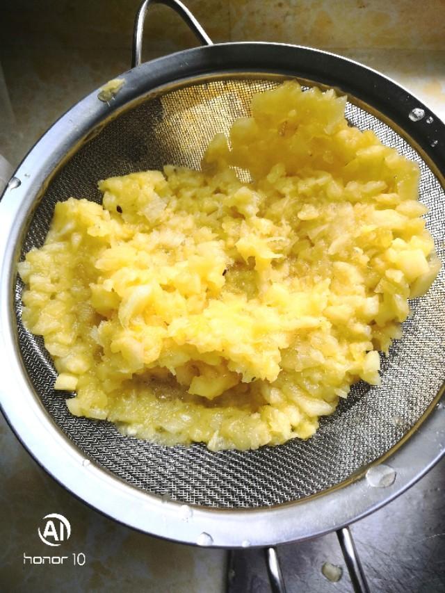 过滤一些果汁,把垛碎的果肉加80g冰糖放不粘锅中先开大火,等水份熬干了就转小火,放40g麦芽糖继续熬,熬到风梨馅颜色变深抱团。