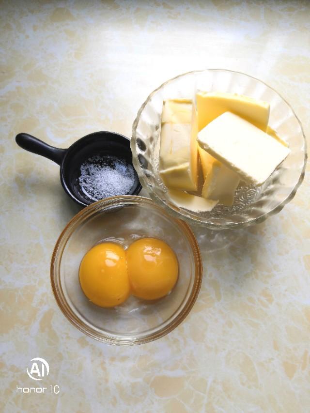 准备低筋粉130g,黄油100g,糖粉30g,奶粉20g,盐1g,蛋黄2只(40g的模具可做12个)。