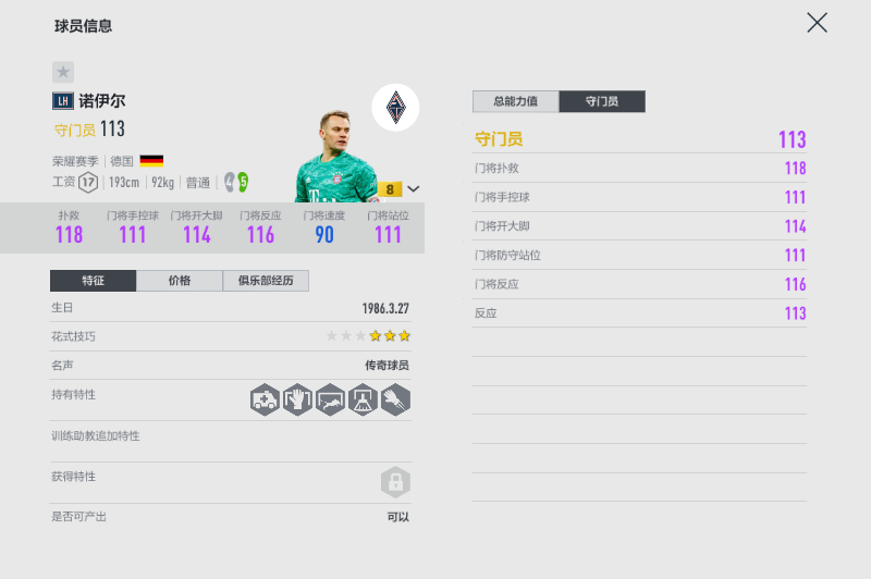游戏中诺伊尔的优秀赛季卡有很多,比如21TY、21TS、EBS等,但是LH金卡是绝大部分拜仁平民玩家的首选,因为其金卡价格也不是很高,而且总评能够达到122,特性也是应有尽有:大力手抛球、冷静处理单刀球、集锦式角球防守等。