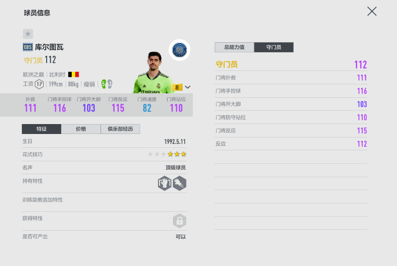 开大脚算是他的一个弱项,加成后只有110多的属性,不过要注意的是库尔图瓦拥有门将大力手抛球特性,这也是门将很实用的一个特性,能够在由守转攻时迅速将球抛给中线附近的球员,从而策动反击攻势。总的来说,库尔图瓦是许多球迷心中的“游戏第一门神”,这张EBS若之后陆续放卡后也可以尝试。