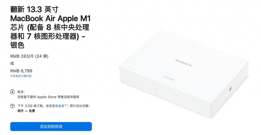 例如,官网 MacBook Air M1 256GB 入门版,原价 7999 元,官翻为 6799 元,便宜了 1200 元。24 期分期后每月 283 元。