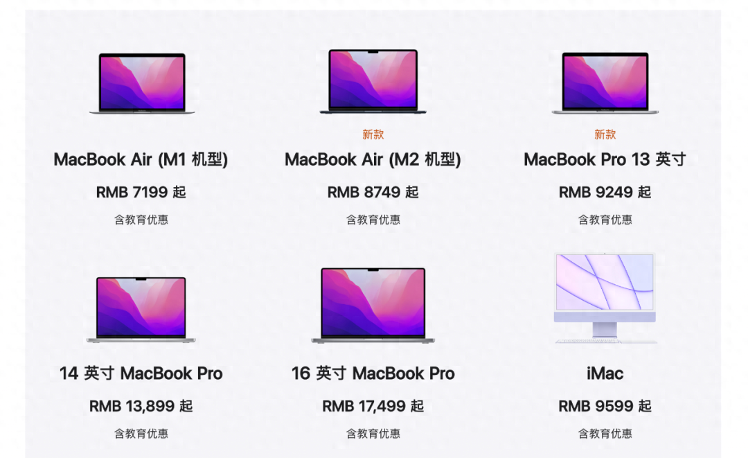 不过苹果教育网返校季都没有 iPhone 选购,但 iPad 和 Mac 等配件选购就很全,像新款 M2 产品,MacBook,iPad Air 5 这种热门产品都有。