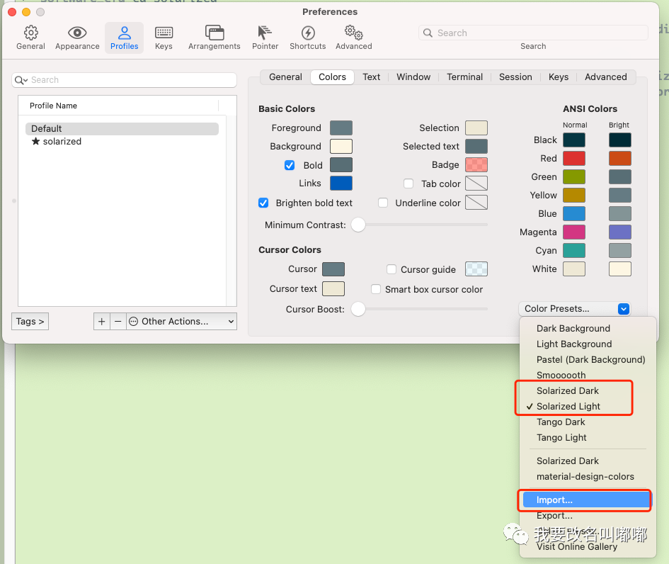 在iTerm2下面导入配置,Vim中设定配置,即可统一使用了。具体见图和下面的内容。