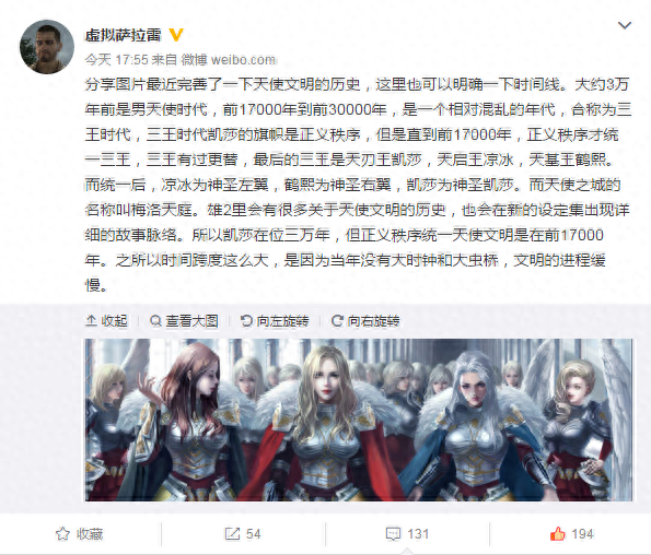 萨拉雷导演原话:最近完善了一下天使文明的历史,这里也可以明确一下时间线。大约3万年前是男天使时代,前17000年到前30000年,是一个相对混乱的年代,合称为三王时代,三王时代凯莎的旗帜是正义秩序,但是直到前17000年,正义秩序才统一三王,三王有过更替,最后的三王是天刃王凯莎,天启王凉冰,天基王鹤熙。而统一后,凉冰为神圣左翼,鹤熙为神圣右翼,凯莎为神圣凯莎。而天使之城的名称叫梅洛天庭。雄2里会有很多关于天使文明的历史,也会在新的设定集出现详细的故事脉络。所以凯莎在位三万年,但正义秩序统一天使文明是在前17000年。之所以时间跨度这么大,是因为当年没有大时钟和大虫桥,文明的进程缓慢。