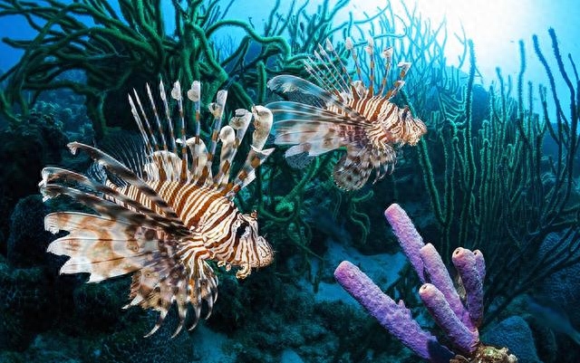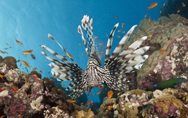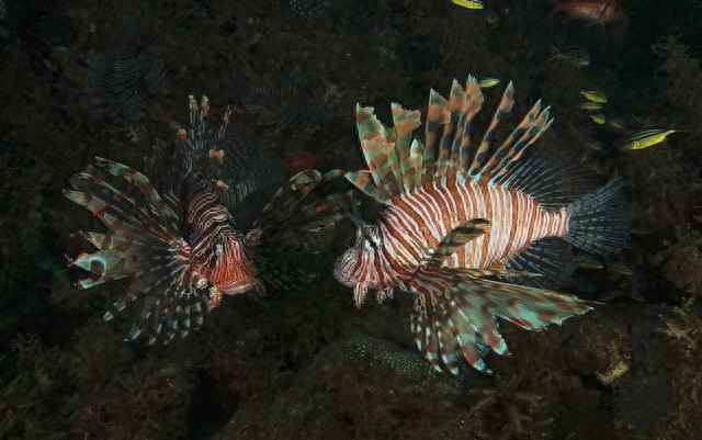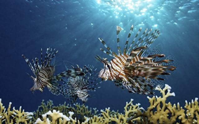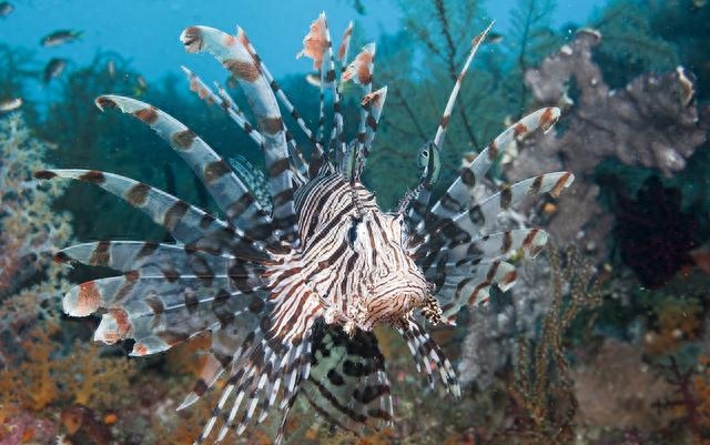 蓑鲉,又称狮子鱼,鲉形目鲉科蓑鲉亚科蓑鲉属鱼类的统称。体长25-40厘米,体表多为黄色,布有红色至棕色条纹,背鳍、臀鳍和尾鳍透明,有黑色斑点。体被圆鳞或栉鳞。吻长而狭,背面中央凸起。眼中等大,上侧位。口端位,斜裂,上颌中央有一凹刻。上下颌和犁骨具牙,腭骨无牙。