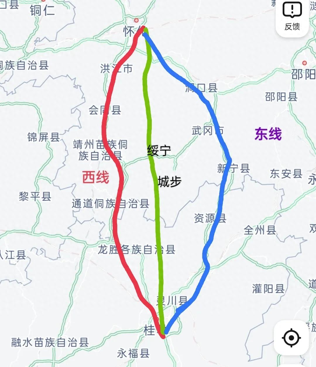 中线线路方案,怀化南--洪江--绥宁--城步--资源--灵川--桂林,