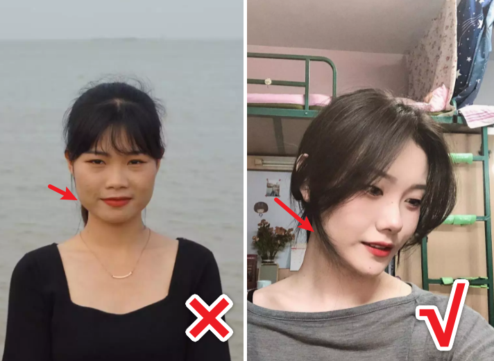 最后无论是短发还是长发,能不露下颌骨的就尽量不露,像全扎发或是露耳短发要尽量避开。尽量选择斜分或是扎发时两边留下侧分发遮挡下颌角。