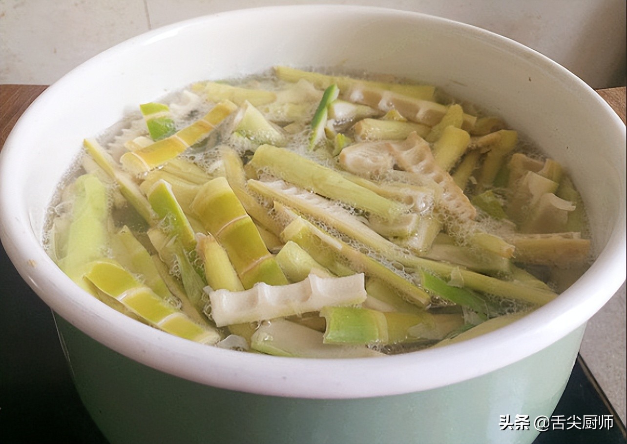 首先将竹笋洗净切成条状,然后放入热水中,煮熟。