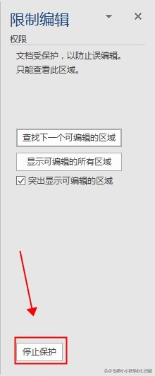 1、点击【限制编辑】窗格底部的【停止保护】按钮。