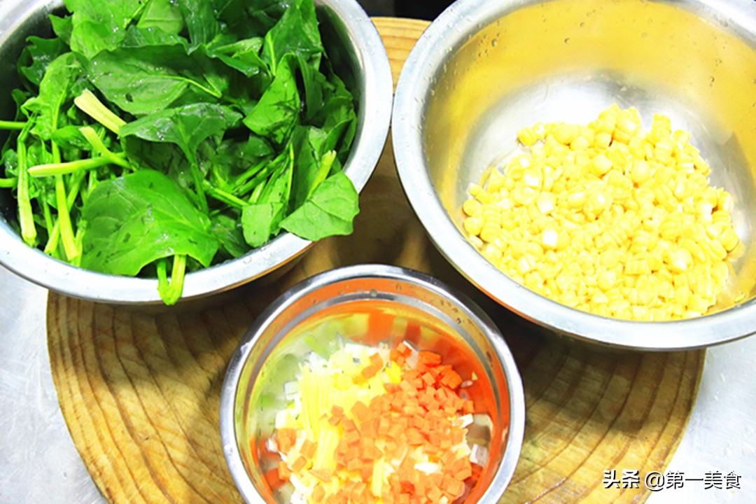 1.首先,我们准备一根嫩玉米,把玉米粒切下来,清洗干净;菠菜一把也洗干净;大葱破开切成葱花,生姜切成姜丝,再切点胡萝卜丁放在一起备用。