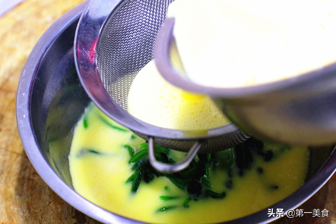 2.盆中打入5个鸡蛋,加入适量凉开水和少许淀粉,加水鸡蛋口感更嫩、淀粉能够增加蛋液的韧性,再加入一点食盐入底味,搅拌打散成蛋液。然后把蛋液和菠菜倒在一起,倒的时候过一下滤网,筛出气泡和没有打碎的蛋清,这样一会蒸出来更加平滑细嫩。