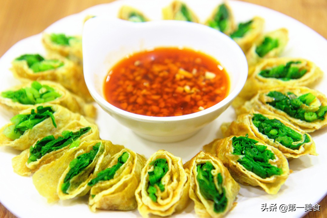 4.把菠菜挤干水分放在鸡蛋皮上,卷成卷,斜切成比较厚的马蹄卷,摆放在盘中。准备一个碟子,把蒜末倒进去,加入食盐,一丁点味精,香醋,生抽,辣椒红油,搅拌均匀摆在中间,就可以食用了。