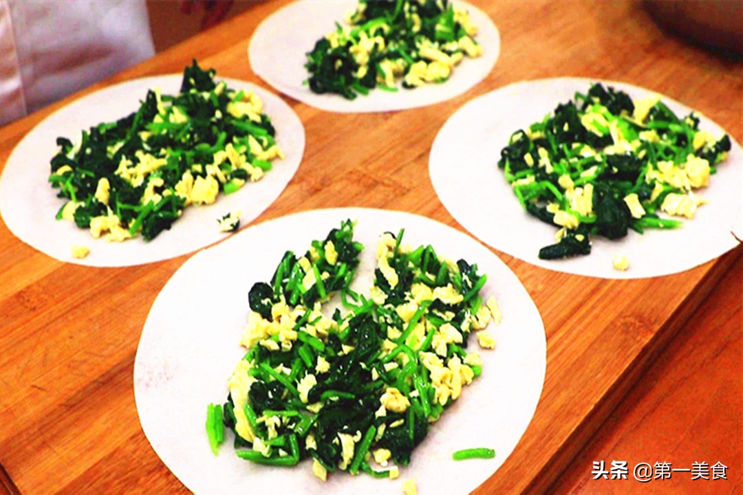 3.准备几张春卷皮,把调好的馅料倒在上面用筷子铺平,然后把春卷皮边缘往里折,包裹住馅料做成菠菜盒的生坯。