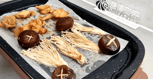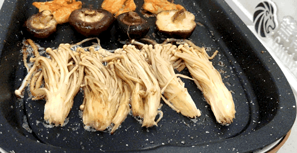 待烤上一段时间,我们对食物进行翻面,发现没有出现明显的粘盘情况,金针菇也可以轻松移动。由于烤制时食材与烤盘直接接触,美拉德反应更强烈,口感会更焦香。