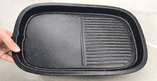 烤盘采用直纹和平面两种板面设计,可以同时进行煎烤,正面覆盖有麦饭石色不沾涂层,具有良好的防粘、疏油效果。