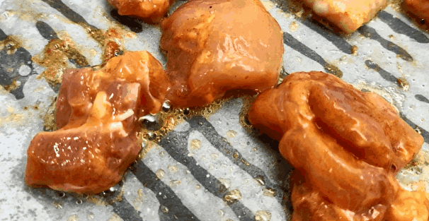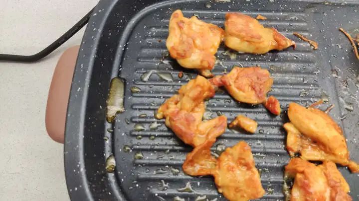 刚放上去不一会儿,鸡腿肉就开始滋滋冒油。