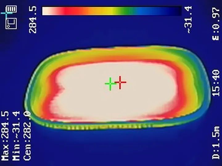 预热结束后我们通过热成像仪观测烤盘整体加热情况,烤盘最高温度达到284.5℃,成像的图片中间颜色几乎趋于一致,说明烤盘表面受热还是比较均匀的。